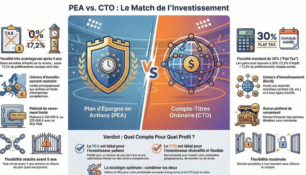 Cette approche hybride permet de bénéficier du "meilleur des deux mondes" : l'efficacité fiscale du PEA pour les investissements de conviction à long terme et la flexibilité universelle du CTO pour le reste du portefeuille.