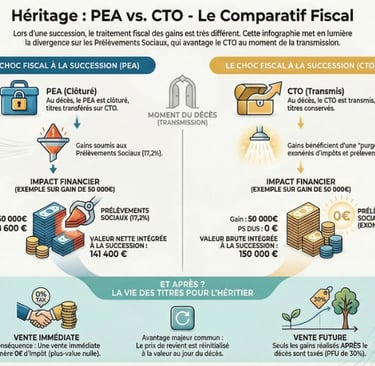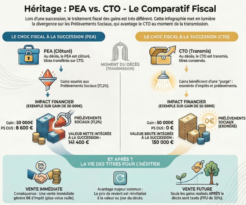 Leçon n°1 : Au moment du décès, le CTO est plus avantageux. Il bénéficie d'une "double purge" fiscale (ni impôt, ni prélèvements sociaux sur les gains), tandis que les gains du PEA restent soumis aux prélèvements sociaux (17,2%).